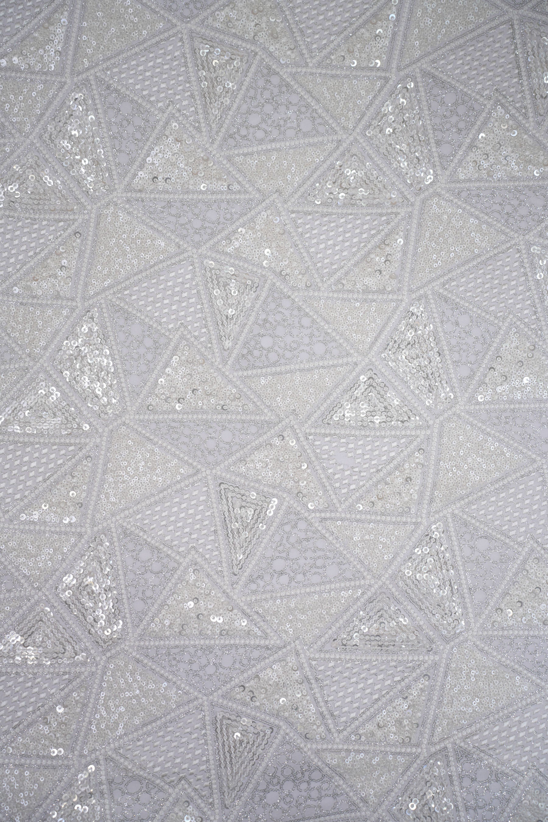 This fabric features a soft grey-silver net base adorned with geometric embroidery in triangular and polygonal patterns. Each section is uniquely detailed with sequins, beadwork, and thread textures such as criss-cross, dotted, and solid fills, creating a patchwork mosaic-like effect.