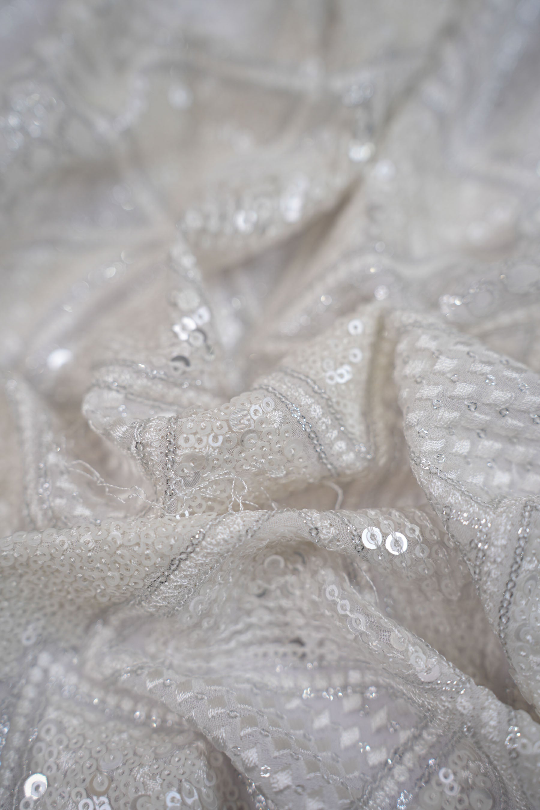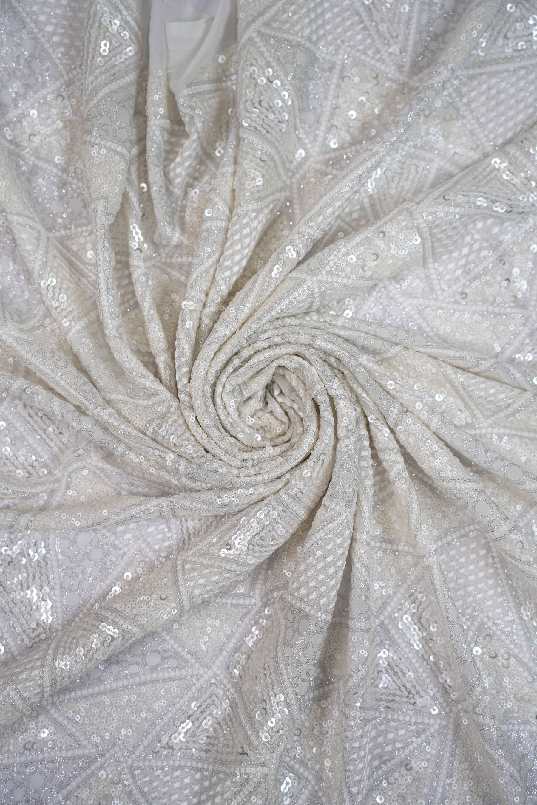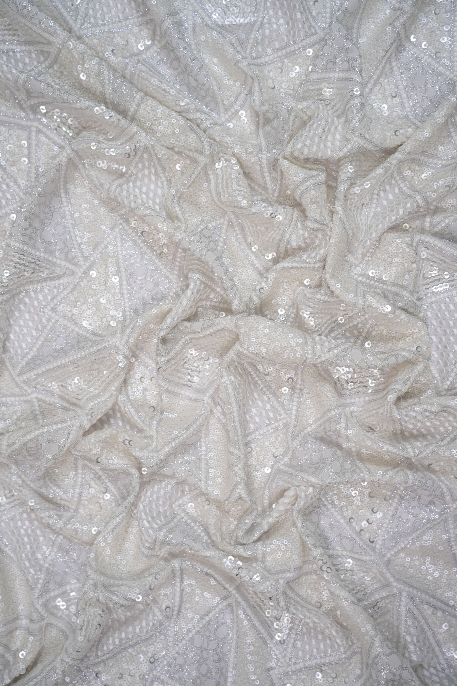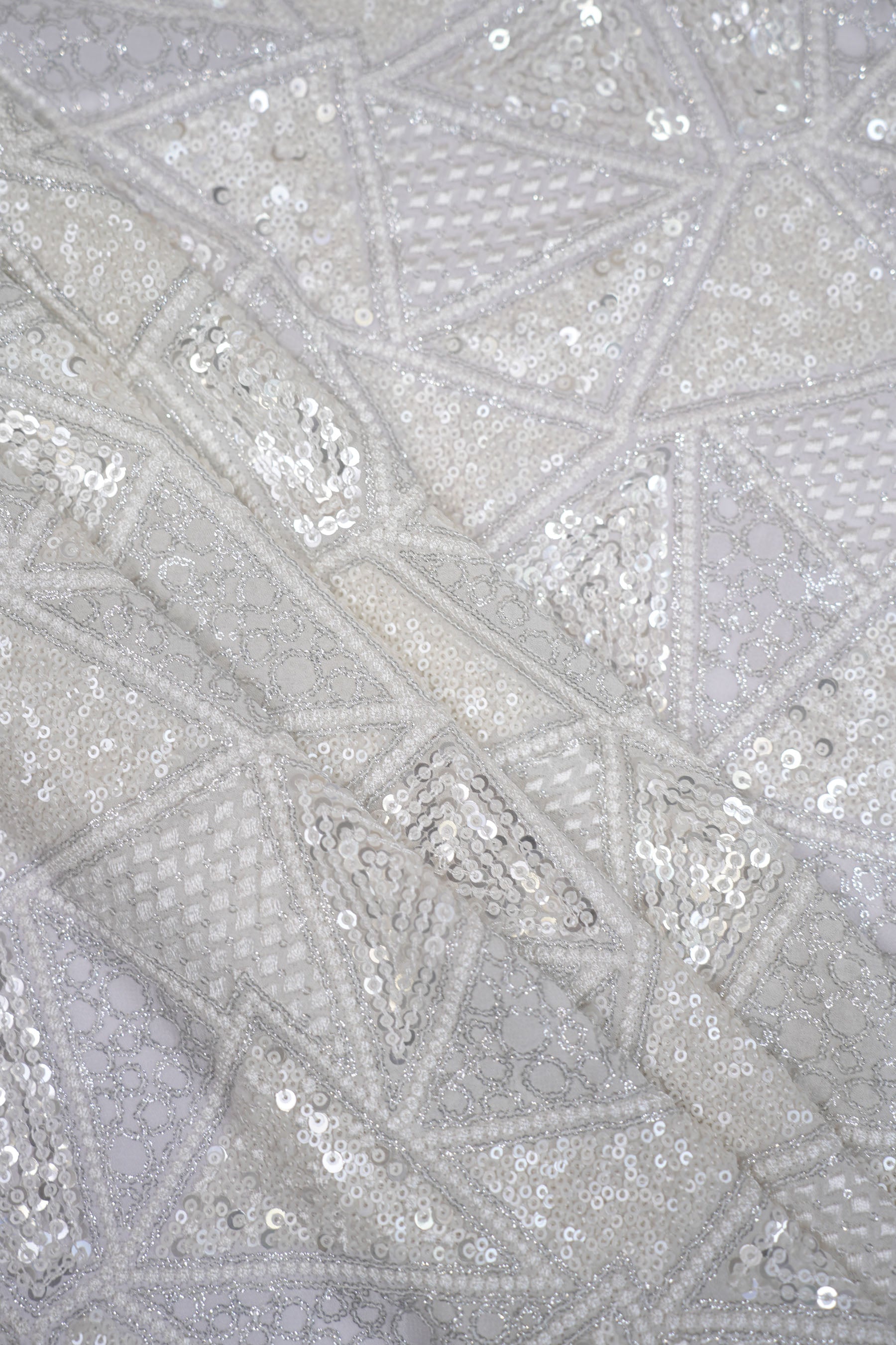 The sequins are primarily in silver tones, giving it a refined metallic sheen that shimmers beautifully under light. The geometric design makes this fabric modern, edgy, and fashion-forward, while the sequin work keeps it festive and glamorous.