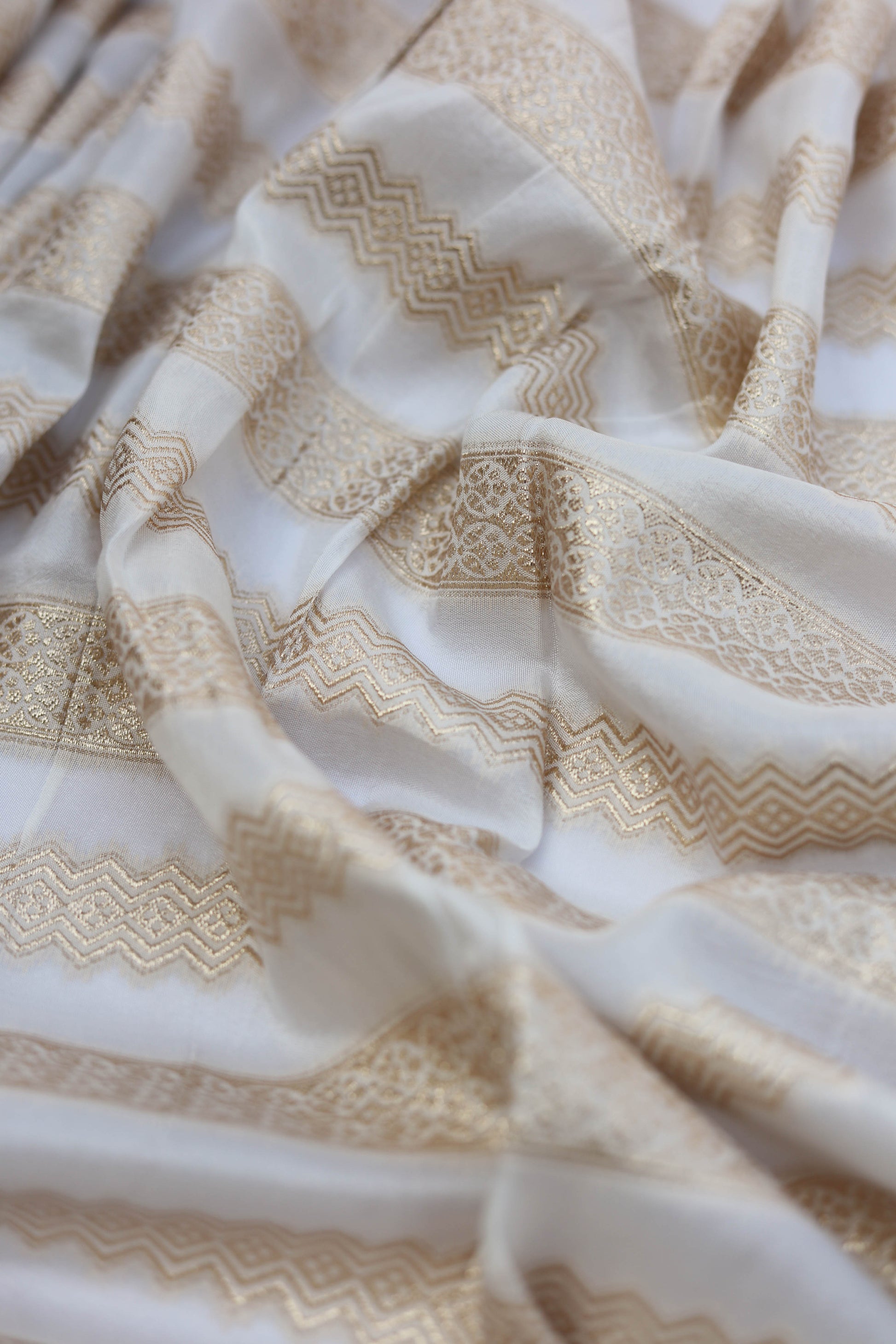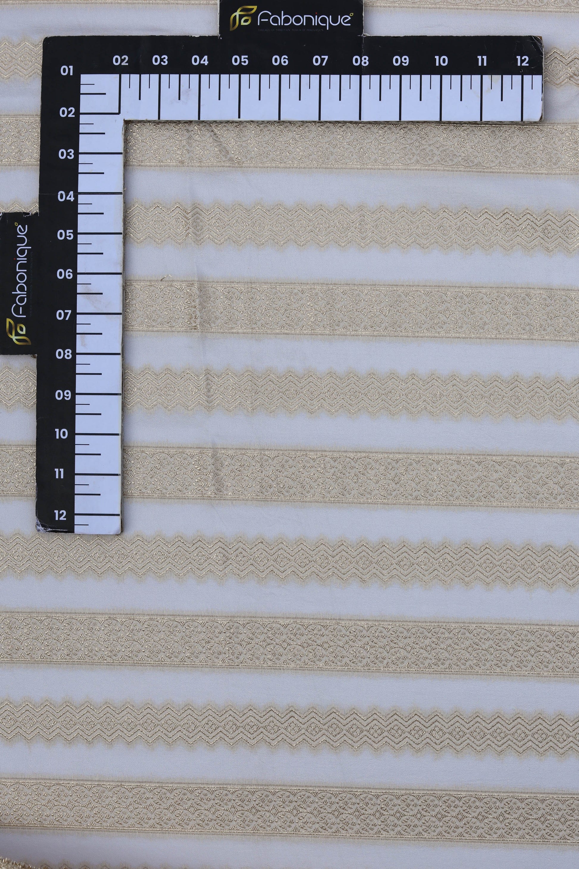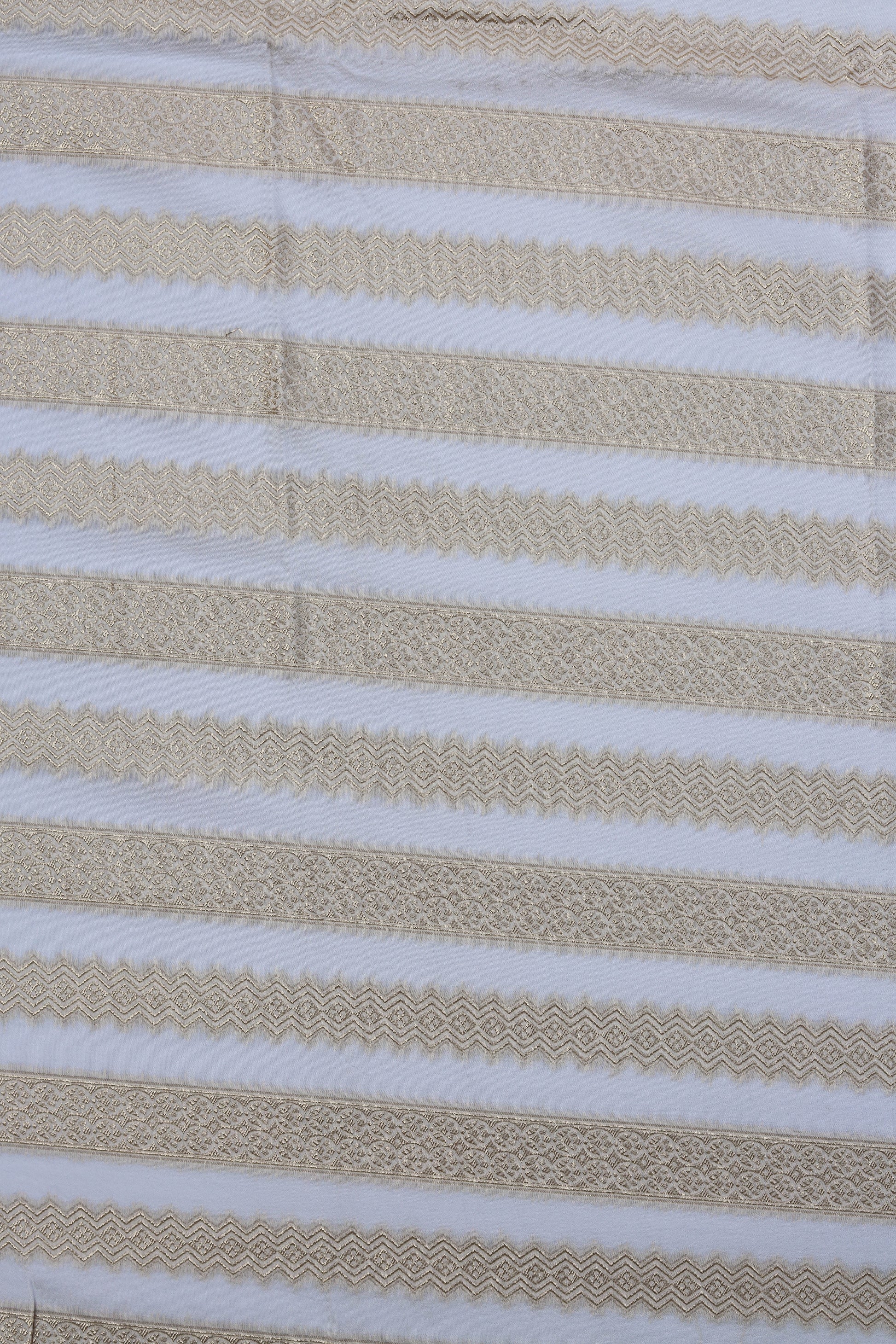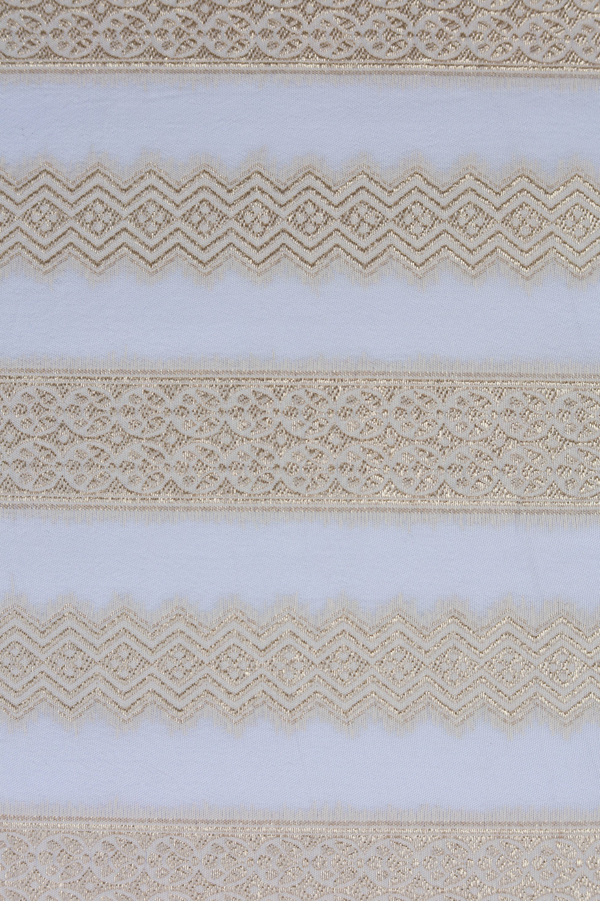 Add a touch of sophistication to your projects with this striped brocade fabric. Featuring intricate zigzag patterns and metallic gold accents on a neutral base, this fabric is a timeless choice for creating elegant garments and home dΓ©cor. Its lightweight yet luxurious texture ensures versatility and refinement.