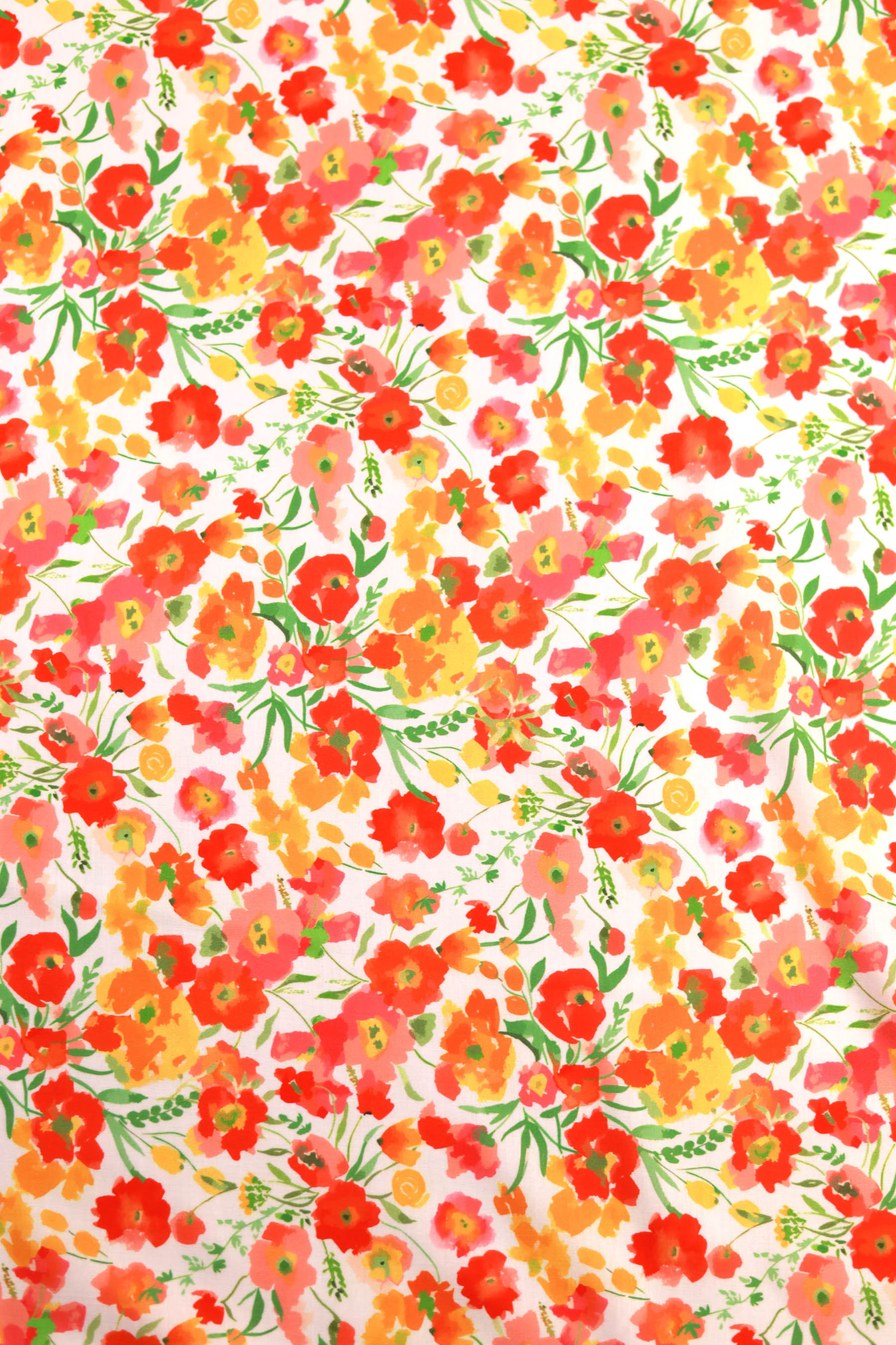 This muslin fabric features a bright and cheerful watercolor-style floral print with shades of orange, coral red, yellow, and soft pink, accented with fresh green leaves. The flowers are scattered across a crisp white base, giving it a breezy, hand-painted look.