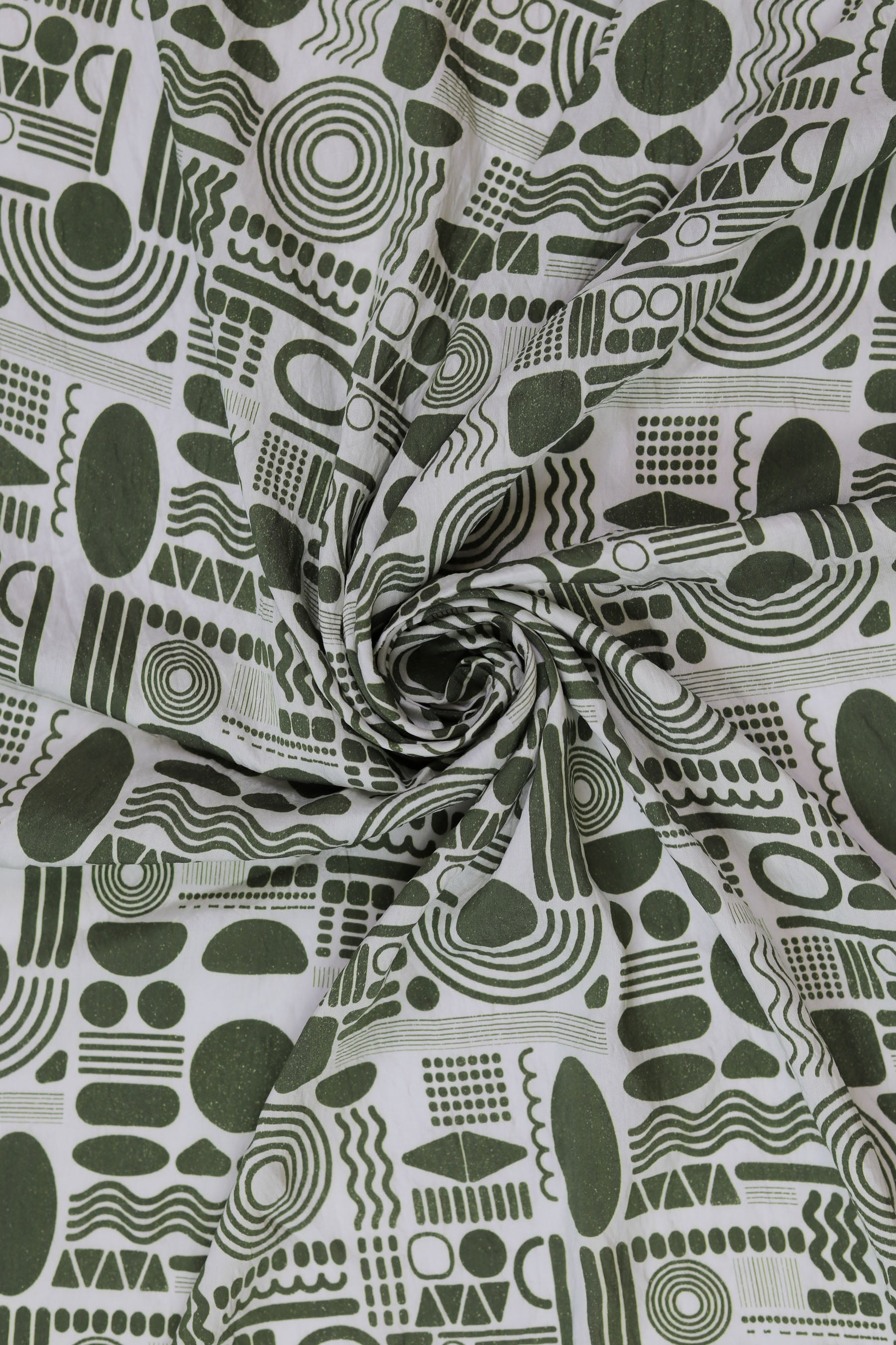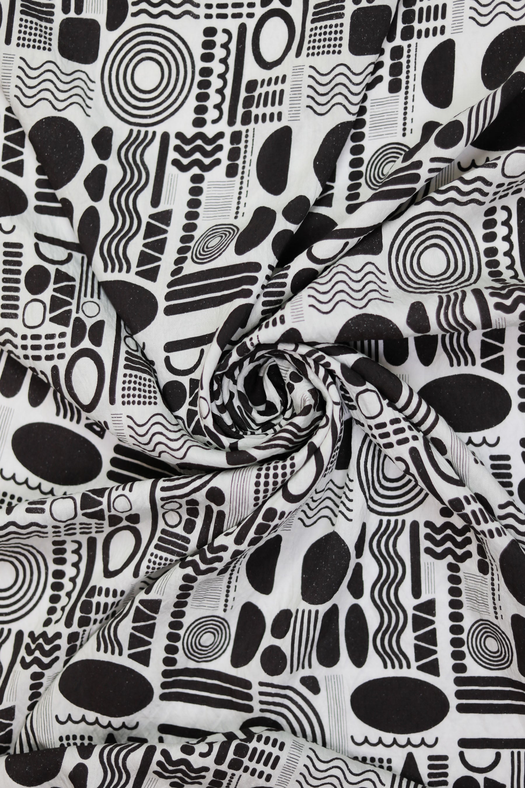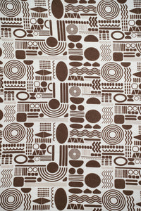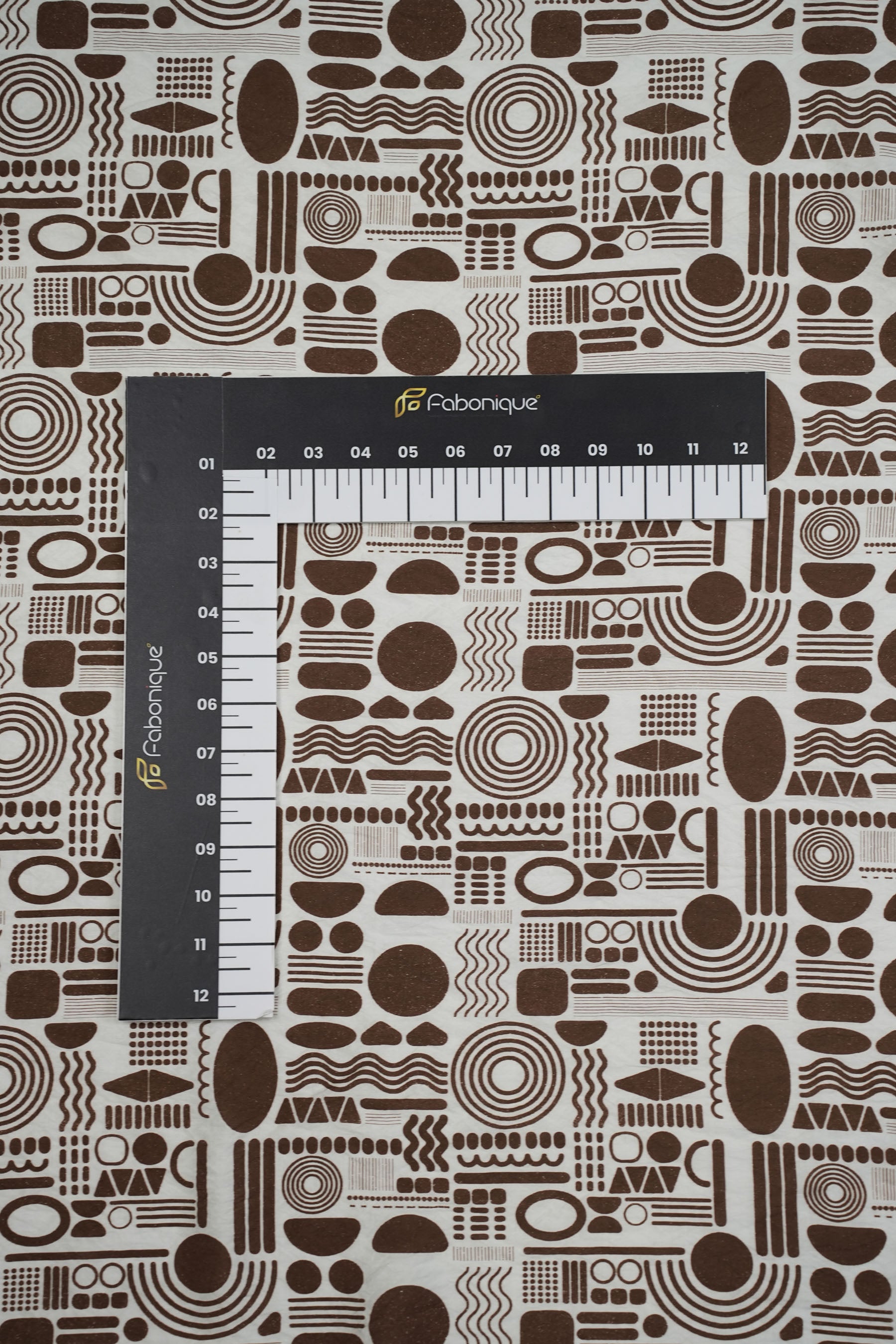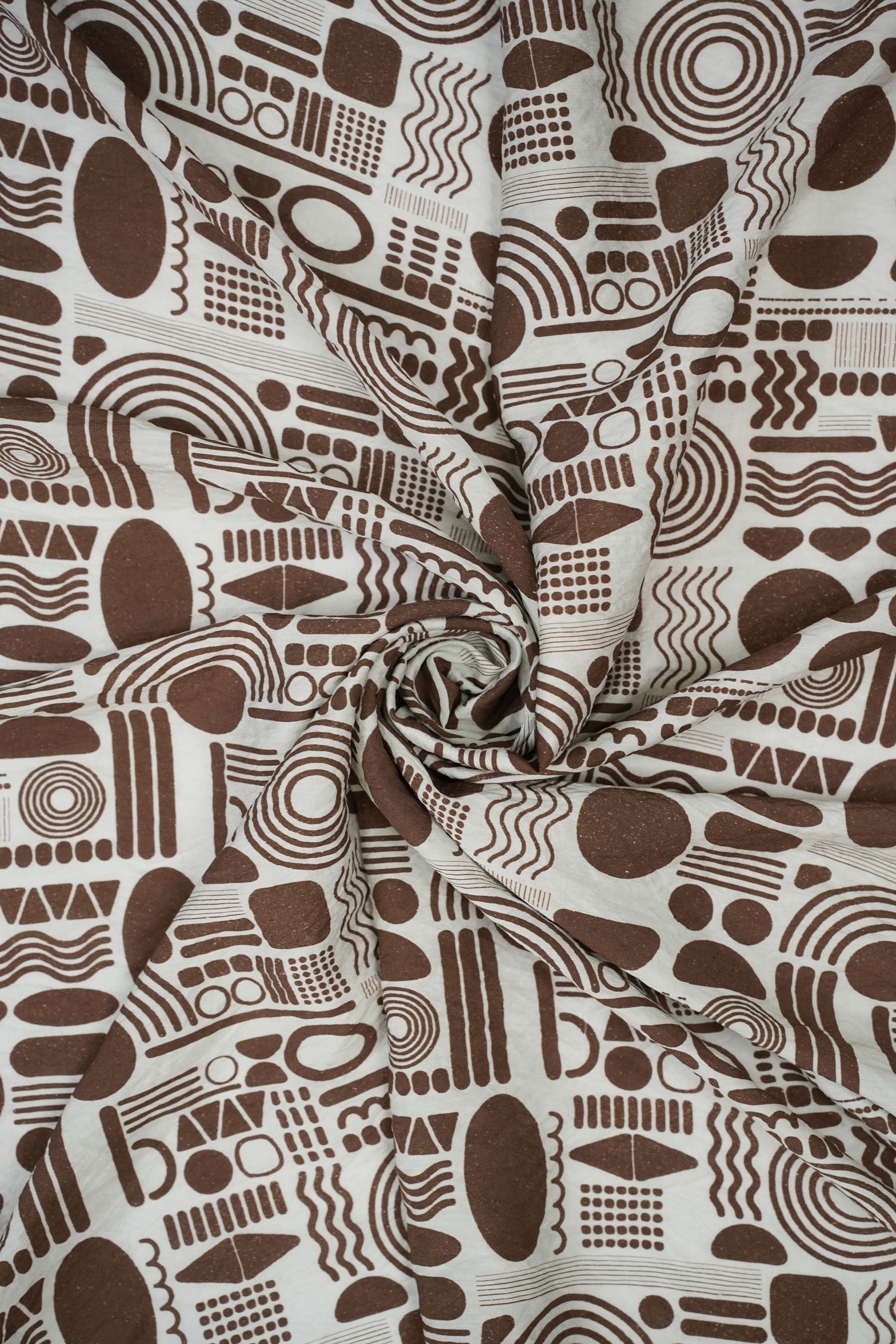 This fabric showcases a bold, earthy abstract print in deep cocoa brown over a warm ivory background. The mix of geometric shapes—circles, lines, and waves—adds a tribal-inspired, contemporary vibe, making it an ideal choice for statement pieces.Composed of 85% viscose and 15% nylon, this fabric has a luxuriously soft hand-feel, a gentle drape, and a subtle sheen that enhances its unique design. It’s lightweight yet durable, offering the perfect balance of elegance and practicality.
