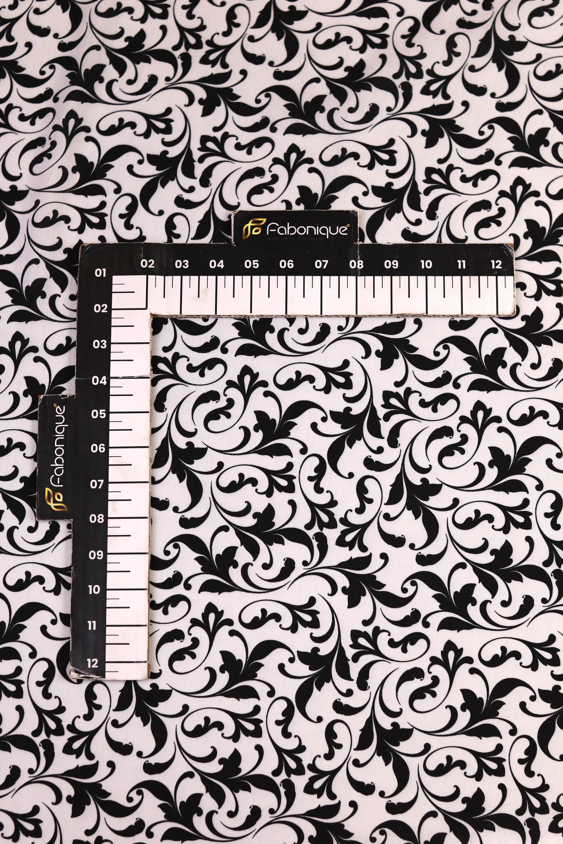This muslin fabric features a white background elegantly adorned with black ornamental vine and floral scroll patterns. The design carries a timeless, vintage charm, reminiscent of baroque motifs, yet remains fresh due to the muslinโs lightweight feel.
