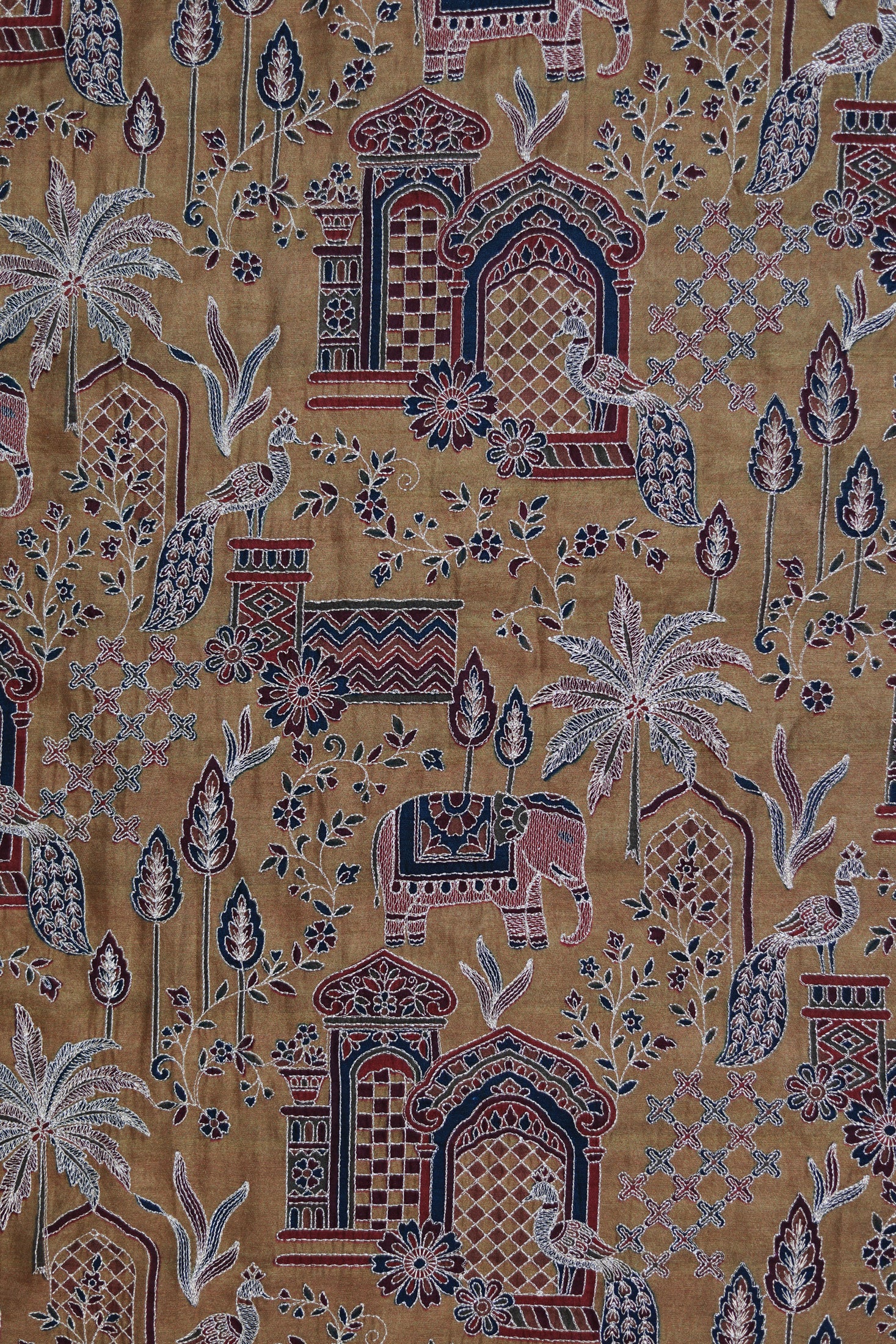 This is a stunning viscose chinon fabric with heritage-inspired embroidery motifs featuring elephants, peacocks, floral vines, and ornate palace arches. The base is a warm golden mustard hue, which beautifully complements the intricate threadwork in shades of burgundy, teal green, ivory, and soft peach. The design feels like a scene out of a royal mural, with an earthy yet elegant vibe.