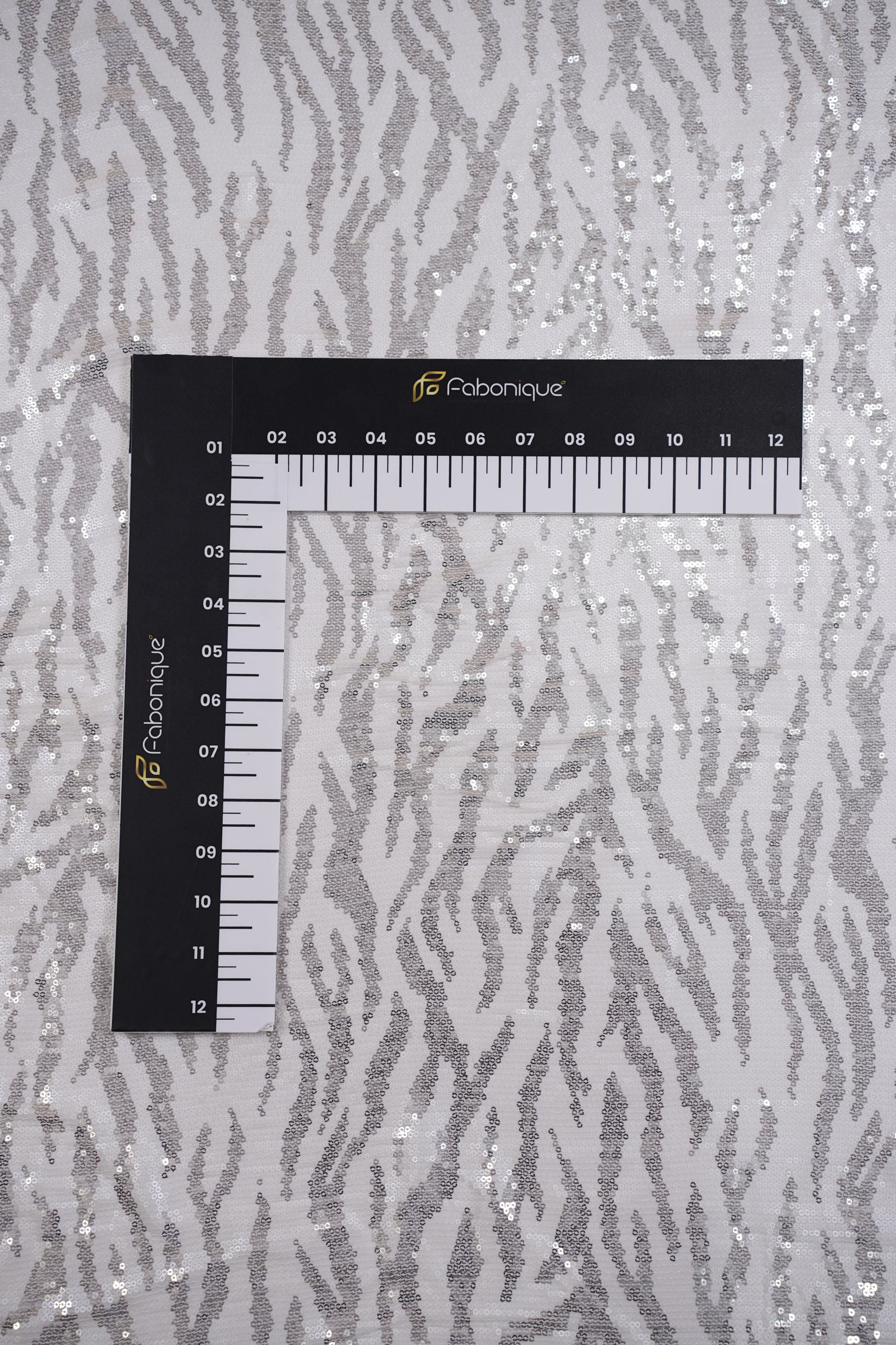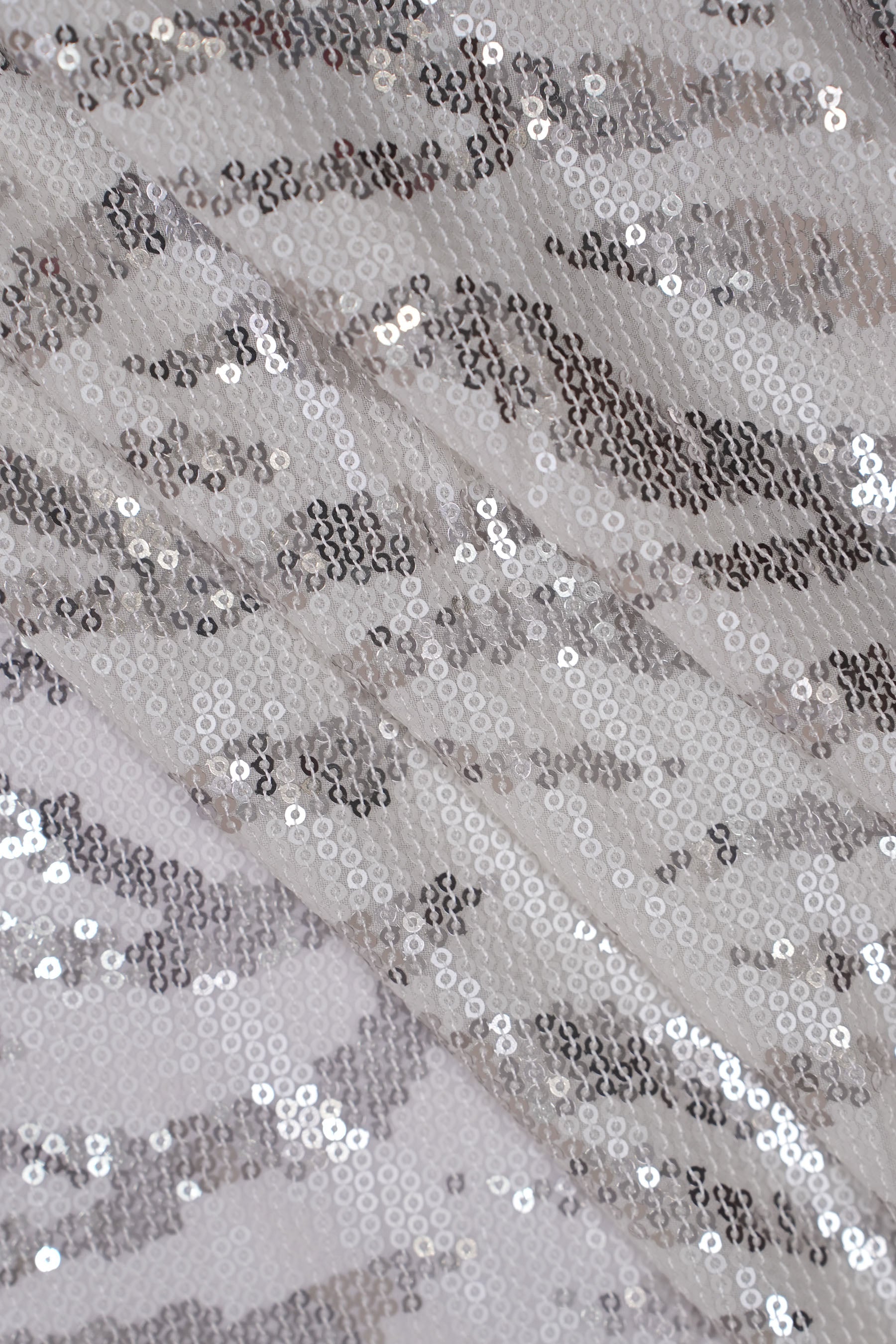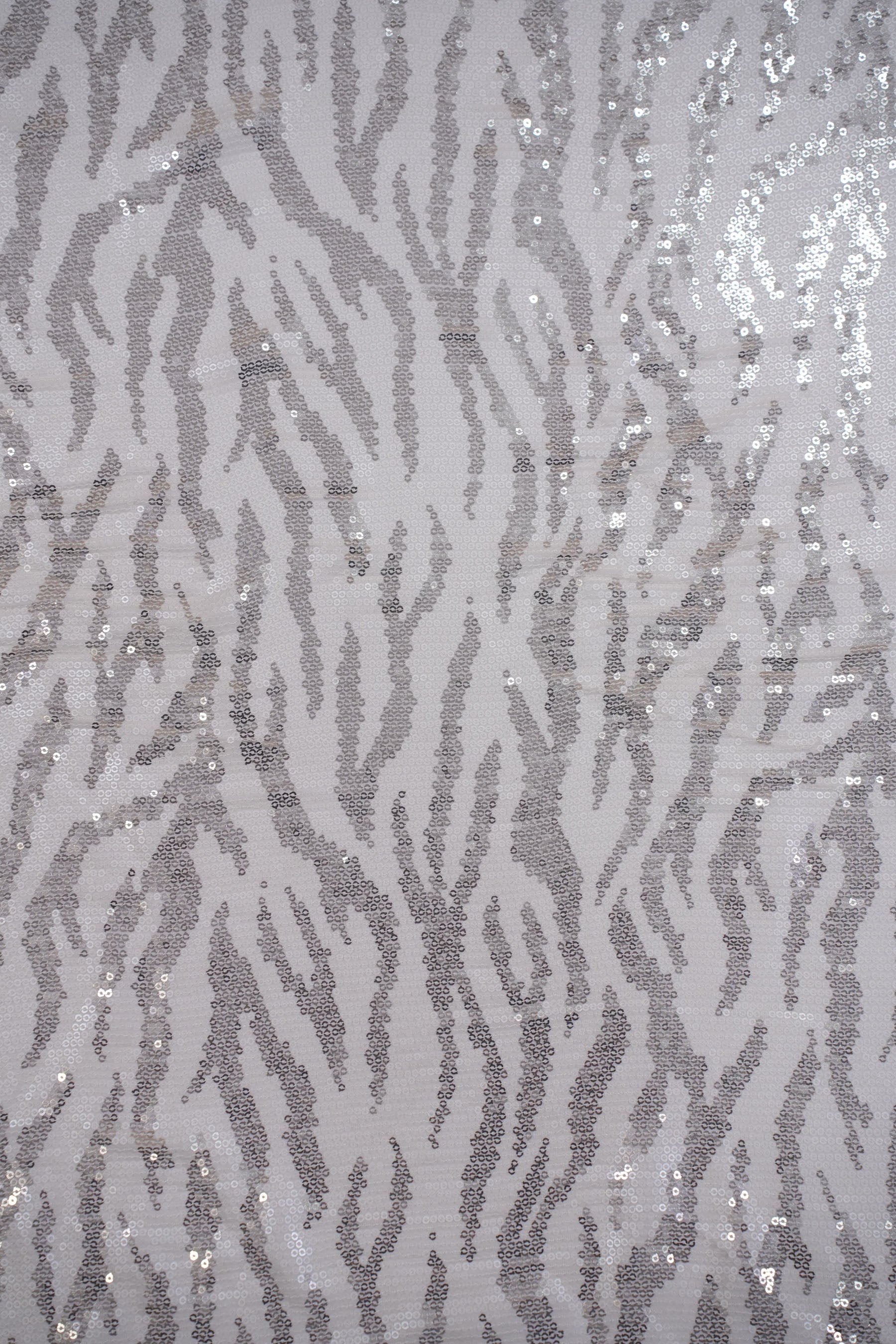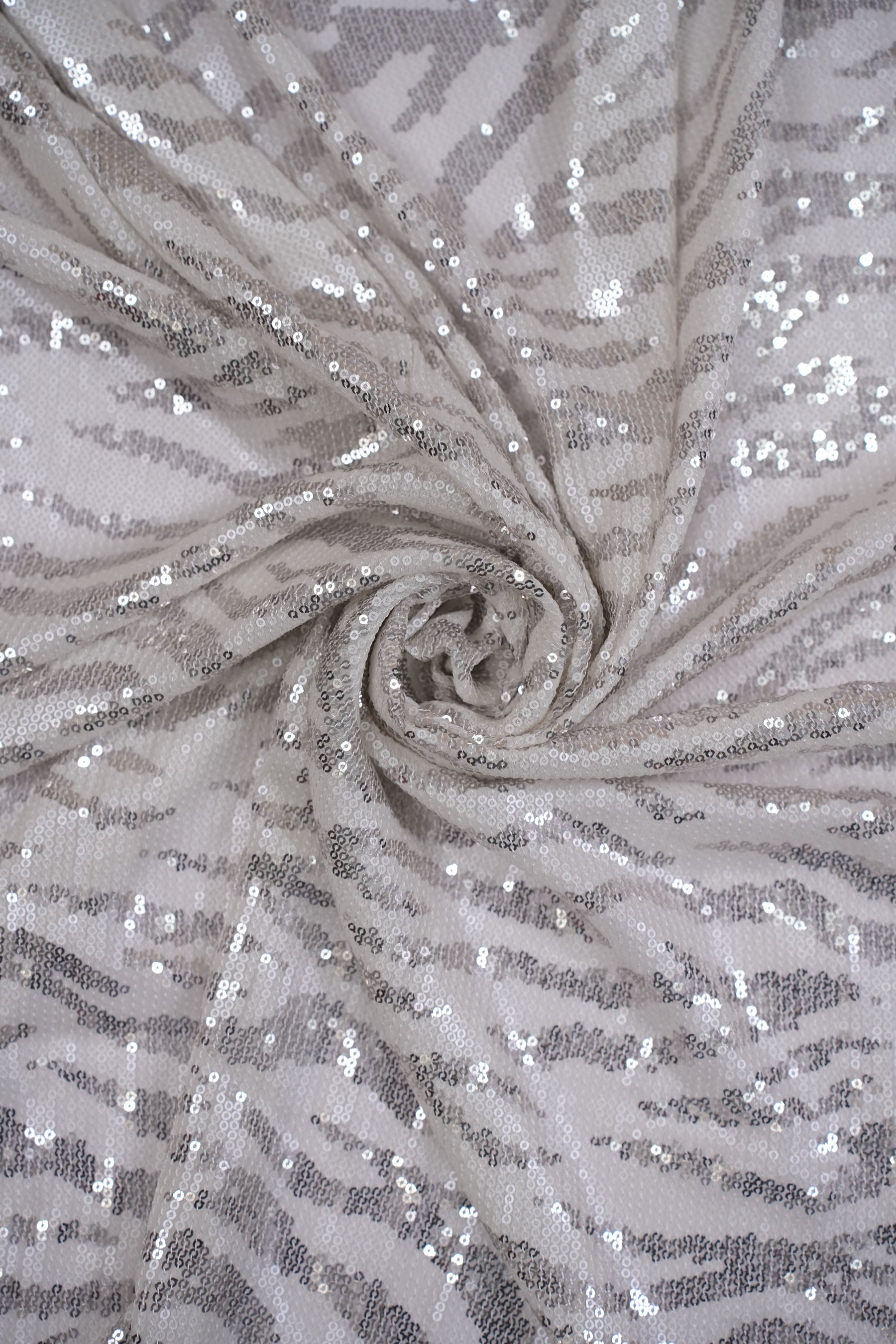 This fabric features a bold zebra-inspired pattern, intricately crafted with shimmering sequins on a sheer/net base. The sequins are arranged in alternating stripes, creating a wild yet glamorous look that plays beautifully with light and movement.